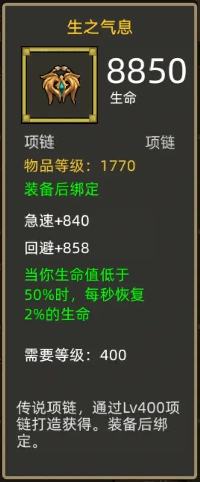 综合点评:这条项链的效果和名称很贴合,在血线掉到一半以下,就会每秒2%回血,还是有一定的上场空间的。自身有版本最高的基础数值,装备效果也能用,对于熊德和血DK这类传统堆血量的专精也是个不错的新选择。