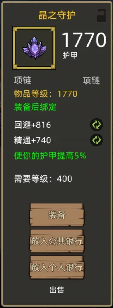 综合点评:爪赞制作项链的过程中疯狂出晶之守护,版本更新到今天足足出了有五条之多,这条项链自身有1770点护甲提升,效果是5%护甲提升,纯粹的数值提升,相比于上面的红项链,其实这种对于防御专精会更实用一些。