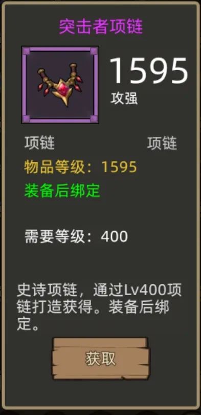 版本初期产量也不多,如果自己玩的专精没有太合适的项链,或者是不想投入太多金币,就可以直接在拍卖行低价买一条,还能筛选毕业词条。400的三个紫色项链分别叫突击者项链(1595攻强)、铁壁护符(1595护甲)、威严颈饰(7975生命)。
