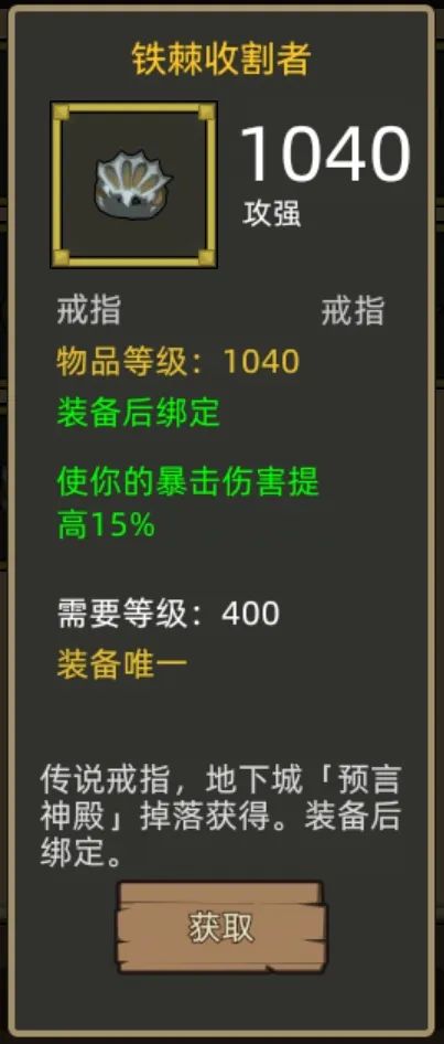 400版本新戒指增加了2个,分别是铁棘收割者(1040攻强+15%暴击伤害提升)和梦魇之瞳(1040护甲+0.5*等级护甲提升),都是毕业热门之选。