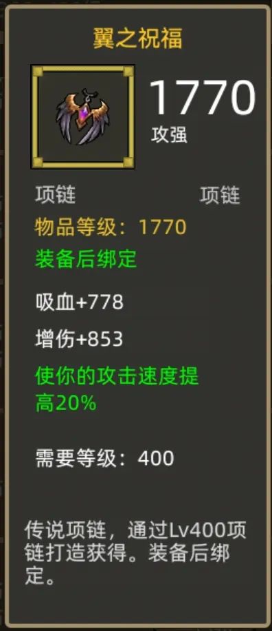 综合点评:每个版本的重头戏就是攻强项链,400版本的传说项链基础攻强是1770点,翼之祝福的效果是20%攻速稳定提升,对于大多数输出专精来说,只要是纯挂机这条项链都可以带,造价相比红项链会低不少。