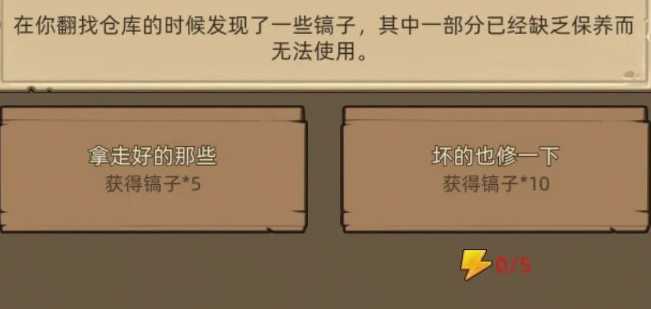 这里简单给新入坑的玩家分享一下思路,如果是高频率登录游戏,可以尽量选拿资源多的选项(双倍体力消耗),比如下图就优先选右边的多消耗体力拿双倍镐子,最大化资源获取,前中期游戏资源都不宽裕。